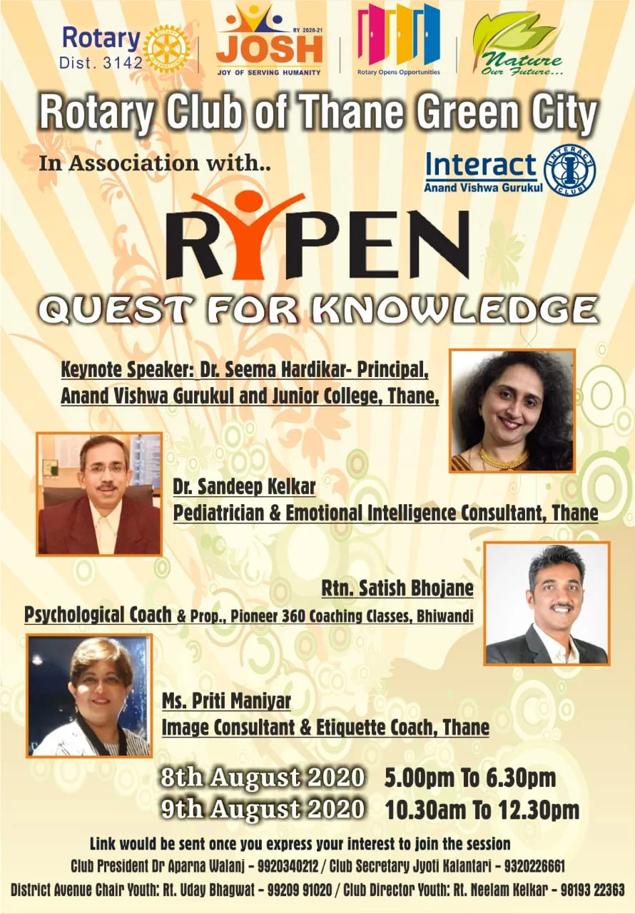 The interact club of Anand Vishwa Gurukul was formed in the year 2010. It is an institutional club that work’s under the Rotary Club of Thane green city, District 3142, Zone 2.